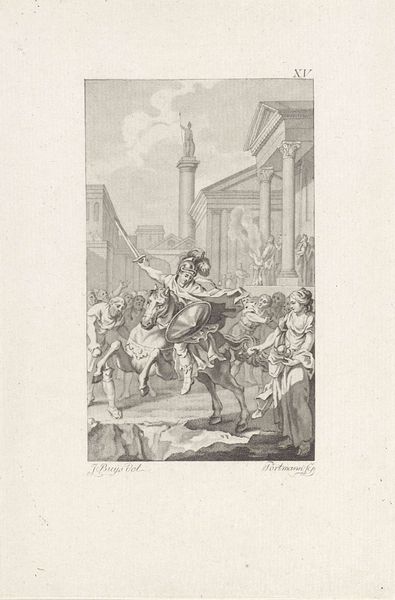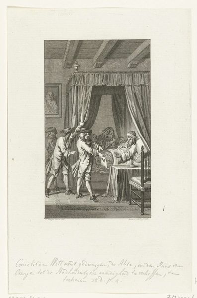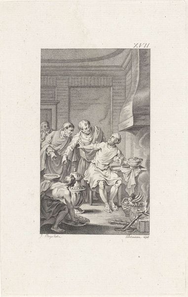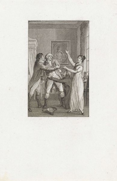 Editor: This print, "Tweegevecht met de degen," or "Duel with rapiers," by Reinier Vinkeles, dates back to 1798. There's such high drama captured in this Baroque interior; it feels like a theatrical production! What do you make of this intense scene? Curator: Immediately, I am drawn to the recurring symbol of conflict itself. The rapier, beyond its literal function as a weapon, represents a clash of ideals, honour, or even social status. Dueling was a highly codified ritual, a performance as much as a fight. The positioning of the figures – one standing victorious over the fallen – evokes the fleeting nature of triumph and the ever-present possibility of defeat. How might societal norms contribute to acts of aggression or passion, especially considering what appears to be witnesses to this conflict? Editor: That's a great point! The witnesses peeking through the doorway certainly suggest this is playing out for an audience, doesn't it? Perhaps honour, but performance is certainly present here. Curator: Exactly! Note also the use of light and shadow – the dramatic chiaroscuro. It's no accident that the victor is more brightly illuminated, reinforcing their dominance within the narrative. Consider how this plays on our own perceptions of power and vulnerability when such visual languages are continuously being communicated. What aspects might speak to our contemporary obsession with spectacle, despite centuries of social change? Editor: It is hard not to interpret this beyond the honor code – a staged event for viewers. Curator: Indeed. I find it revealing to observe these echoes through time. Perhaps Vinkeles is reflecting a more broadly recognized performance of self within strict social constraints that resonate into contemporary society as well. Editor: That offers a fresh viewpoint. Now, thinking of it as a study of character gives it so much depth. Curator: And visual literacy enables us to connect these threads throughout history.