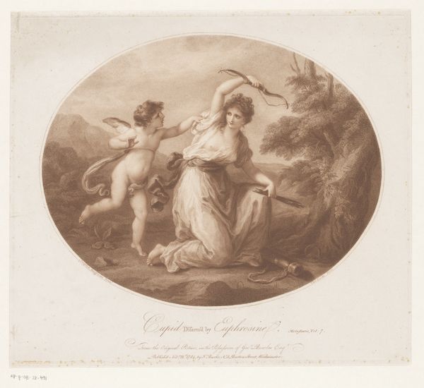 "Mildness Binding Cupid's Wings" was created around 1796-1800 by P.J. Chaillou, an artist whose brief life coincided with the tumultuous years of the French Revolution. This print encapsulates a particular vision of femininity and power. A seated woman, draped in classical robes, gently binds the wings of Cupid, the god of love. The act itself speaks volumes. In a patriarchal society, the binding of Cupid symbolizes a negotiation of power, where "mildness" becomes a tool for controlling and domesticating a force as wild and unpredictable as love. The image also suggests a commentary on the societal expectations placed on women during the late 18th century. In a time of political upheaval, the representation of women as figures of restraint and moral guidance would have resonated deeply. But consider too, that the woman's gentle act might also imply a critique of the era’s rigid gender roles. Does the binding suggest an enforced compliance? Ultimately, "Mildness Binding Cupid's Wings" invites us to consider the complex interplay of gender, power, and desire in a world on the cusp of profound change.