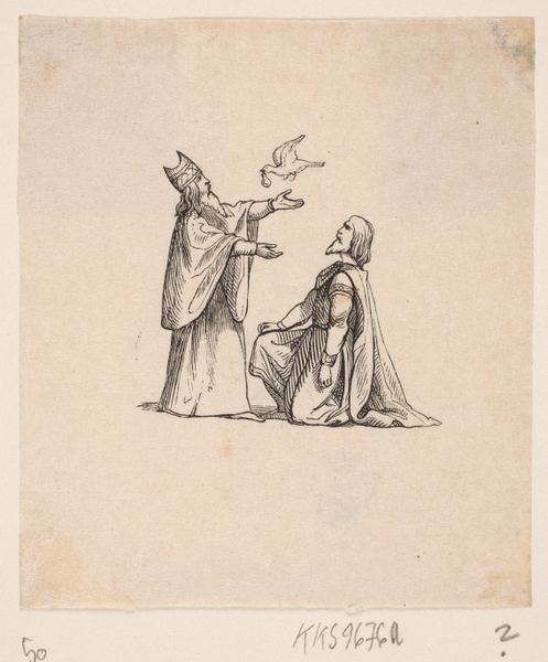 Curator: Welcome, everyone. We're looking at "Kruier levert een kist af bij een non," which roughly translates to "Delivery man drops off a box to a nun," a watercolor drawing by Frédéric Bouchot, dating from around 1831-1832. It’s currently housed here at the Rijksmuseum. Editor: It’s strangely charming! The muted colors give it an understated feel, but there is tension between the somber nun and the burdened but hopeful looking delivery man, or kruier. You can almost hear the thud of that crate on the tiled floor! Curator: Yes, the visual tension tells a fascinating social story. Notice the architectural details of the interior: barred windows and rather severe surroundings indicate the limitations placed on those inside the monastery at the time. Editor: Absolutely. Look closely at that crate. Its rough texture and construction suggest that it may have come from some kind of trade industry. The care with which the kruier is handling it highlights his own labor within that supply chain. I bet he put his all into this crate to please this Nun. Curator: Interesting. Consider what's *inside* the box too! Bouchot presents this moment amidst a wave of renewed interest in monastic life following periods of revolution in Europe, in which the church's role came to the foreground in French society. The items in this box would speak directly to debates around what convents could and should be contributing to the public sphere. Editor: Right! This begs questions about the nature of labor, even religious labor. What constitutes 'work' when it’s conducted within the cloistered environment? What impact does their labor and craft have on the outside society? And ultimately, what impact does a transaction have for each individual represented within? Curator: I’m intrigued how it offers insights into the perception of labor in 19th-century religious life and its contribution to the public imagination. Editor: And I keep wondering what the nun ordered. Regardless, it brings the outside, literally inside. The romantic depiction is interesting too considering they most likely labored for extended periods. It humanizes people performing tedious craft. Curator: A moment captured between social spheres of the time, then! Editor: Absolutely—a fascinating window into a world we don't often get to see visualized. Thank you for shining a light on the societal implications of Bouchot's work.