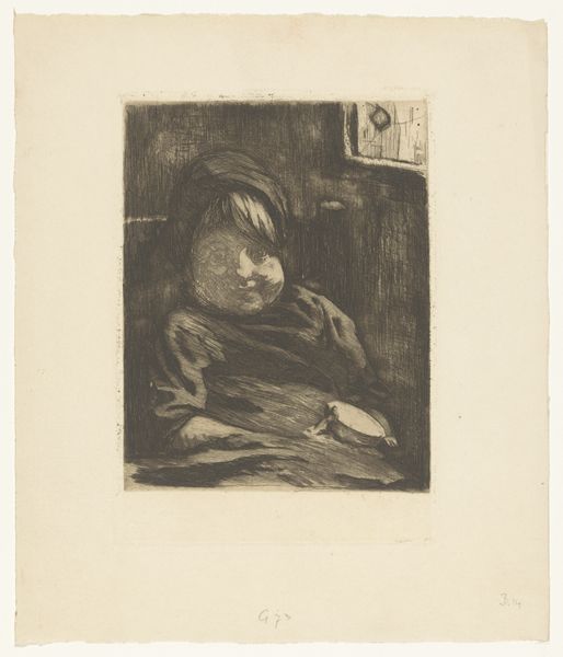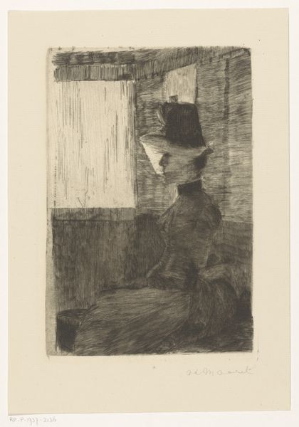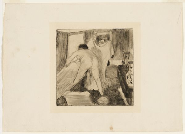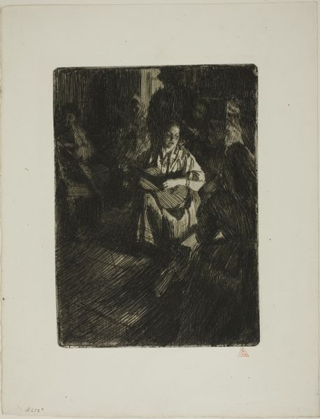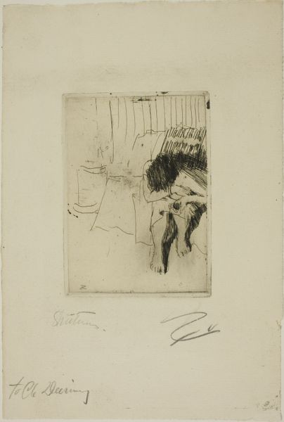 Anders Zorn created the etching "Surprised." Zorn, as a prominent figure of the Swedish art scene at the turn of the century, captured intimate, domestic scenes. This one offers us a glimpse into private life. The woman depicted is caught off guard, perhaps interrupted from a moment of rest or reflection. Zorn's era saw shifts in societal norms around gender and privacy. Representations of women in art were evolving. There was a move away from idealized portrayals and towards more realistic and personal depictions. While Zorn often celebrated female beauty, works like this also hint at the complexities of women's lives beyond the public sphere. The somewhat obscured setting and the woman’s startled reaction evokes a sense of vulnerability and the negotiation of personal space. Consider how Zorn uses the etching technique to create a contrast between light and shadow. This enhances the emotional intensity of the scene. "Surprised" resonates not only as a study of a fleeting moment, but also as a reflection on the changing representations of women and the dynamics of privacy during a transformative period in history.
