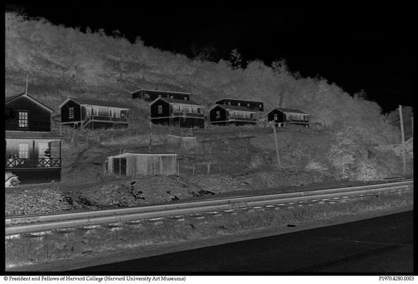 Editor: This is "Untitled (Purseglove Coal Mining Company houses, Osage, Scott's Run, West Virginia)," attributed to Ben Shahn. It's a small photograph, and the inverted tones give it such a ghostly, unsettling feel. What strikes you about this image? Curator: Well, the social context is key. Shahn was deeply invested in documenting social injustice. This image, likely from the 1930s, speaks to the poverty and exploitation prevalent in coal mining communities. The composition, with the tracks leading into the scene, almost feels like a visual metaphor for entrapment. Editor: Entrapment, that's interesting. So the landscape itself becomes a kind of cage? Curator: Precisely! And consider the lack of individual figures, the uniformity of the houses... it reinforces a sense of anonymity and powerlessness. The museum's role, then, becomes vital in giving voice to these histories. Editor: I hadn't thought about the museum's role that way. It makes me see the image's starkness as a deliberate commentary. Curator: Exactly. It's a powerful reminder of art's ability to expose uncomfortable truths and advocate for social change.