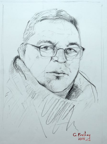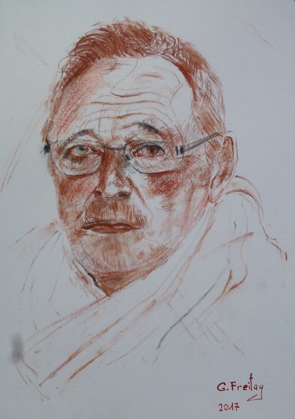 Gazmend Freitag made this drawing of Hubert Thurnhofer in 2017. I'm thinking it's conté crayon, or maybe pastel, something dry and dusty like that. What I love about this portrait is the texture. You can really see the marks, how they build up to create the form. Like around the eye socket, the way Freitag uses these little strokes to give a sense of depth and volume. The physical act of drawing becomes really apparent. And that makes the portrait feel so immediate and alive. I also like how the red interacts with the white of the paper. The paper isn't just a background, but an active part of the image. Look at the way the lines are smudged, almost like they're fading away into the whiteness. It reminds me a little bit of Giacometti. He also used a similar technique of layering and erasing to create these haunting figures that seem to be constantly disappearing. The way Freitag embraces the ambiguity of the medium. It's not about perfection, it's about process, about the ongoing conversation between the artist and the artwork.