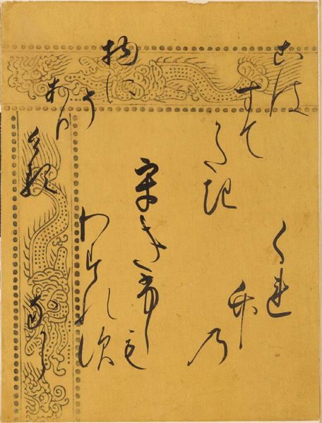 Curator: Here we have "The Pilgrimage to Sumiyoshi," a calligraphic excerpt from Chapter 14 of the Tale of Genji. The artist is Konoe Hisamichi. Editor: Its delicate strokes overlay the salmon background, almost like scattered thoughts adrift on a rosy sea. Curator: Indeed. This is no mere transcription; it is a visual interpretation of Genji's world. The elegant script reflects the refined sensibilities of the Heian court. Editor: And the placement? The characters almost dance, a controlled chaos within the decorated borders. The dragon motifs add a mystical flair, don't you think? Curator: Absolutely. They evoke the divine protection sought during pilgrimages, while the calligraphy itself elevates the text beyond narrative into a form of spiritual expression. Editor: Looking closely, the density of the ink varies considerably across each stroke, creating an intriguing texture. A testament to the artist's sensitivity and the depth of the literary work it represents. Curator: Precisely, it's a wonderful confluence of artistic and cultural meaning, a testament to the power of calligraphy as more than just writing.