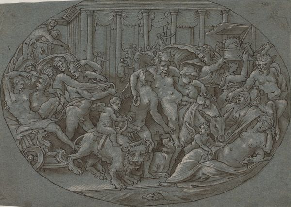 Editor: Looking at this flurry of churning figures, my immediate response is one of controlled chaos, as though frozen in a violent narrative. Curator: Indeed. What we're seeing is "Battle of the Sea Gods [left half]" by Andrea Mantegna, an engraving executed before 1481. It is a complex and vigorous display rendered with a dense network of etched lines. Editor: Etching, precisely, adds an important textural layer to this drama. Tell me more about the labour behind it. Curator: The Italian Renaissance saw engraving elevated from mere craft to an intellectual pursuit. The process involves meticulous preparation of the metal plate, precise carving, and an understanding of chemical reactions to achieve desired depths and intensities. Mantegna's mastery here elevates etching to a vehicle for intense expressiveness. Editor: It does remind me of monumental frescoes, distilled into a smaller, repeatable format. I am thinking about all that human effort to produce it, though, the production and circulation, the knowledge sharing and artisanal practices... Curator: Undoubtedly, this print is evidence of evolving values placed on skilled work within the Renaissance workshop. Looking closer, the figures strike me as embodying ideals rooted in classical sculpture and mythology. Consider the sinuous musculature of these figures, their dynamic poses – each is positioned to direct the eye through a balanced yet agitated composition. The whole seems designed to convey potent and immediate narratives, like the triumph of virtue. Editor: I can see that from a formal perspective; it definitely echoes Renaissance values in human form. But I also notice that sea creatures have as much compositional space and significance as these idealized men. Curator: That tension is essential, offering dynamism. The sea serpents echo the forms of the fighting tritons, thus connecting and contrasting nature and idealized humans, inviting layered interpretation. Editor: In the end, "Battle of the Sea Gods" highlights Renaissance ingenuity. With so much craft behind it, it seems this particular form also allows for democratization and popularization of artistic narratives for years to come. Curator: Yes. Mantegna has provided a window onto the rich tapestry of cultural ambition, condensed into an exceptionally wrought object of its age.