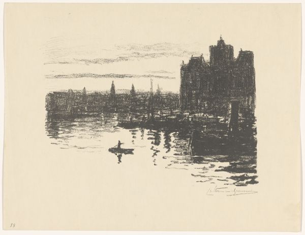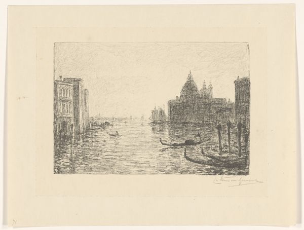 Editor: So, this graphite drawing by Carel Nicolaas Storm van 's-Gravesande, "View of Venice with a Gondola," likely created sometime between 1851 and 1924, really captures a specific mood, almost melancholic, don’t you think? The cityscape is faint, the gondola the main subject, what do you see in this piece, considering its potential symbolism? Curator: I see Venice, not just as a city, but as a symbol itself. For centuries, Venice represented a bridge between East and West, a center of trade, and a crucible of cultural exchange. Look how the artist uses the gondola. It's not merely a boat, but an emblem of Venetian identity, silently navigating the waters. Don't you feel that sense of mystery that shrouds this piece? The buildings almost fading? Editor: Yes, definitely! The way the architecture sort of dissolves into the atmosphere makes it feel like a memory, distant and perhaps idealized. Curator: Precisely! The vagueness of the buildings almost turns into a visual metaphor. A place built on water that might, at some point, return to the sea. How much do you think of Romanticism being a contributing lens for this piece, knowing how preoccupied artists were with landscape and emotion during that time? Editor: That's a great point, and considering that 's-Gravesande was a Romantic painter, maybe Venice, to him, wasn't about documentary but really more a study on mood... what feelings the image could evoke in its viewer. Curator: I agree, and through careful consideration of symbolism and its interplay with memory and emotion, the artist makes it unforgettable. Editor: I hadn’t considered Venice itself as such a potent symbol. This gives me so much more to consider! Curator: Indeed. The artist’s choice of subject offers layers of cultural meaning waiting to be discovered.