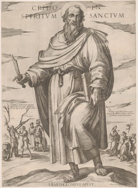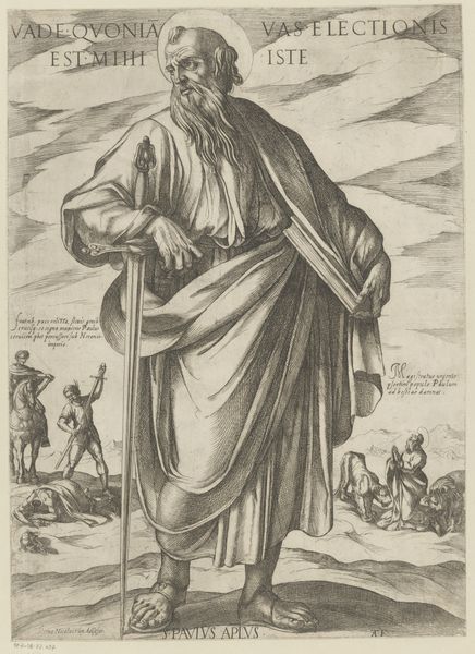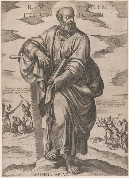 Curator: Right, let's talk about this striking print. It's Antonio Tempesta's depiction of Saint Matthias, dating from between 1585 and 1615. This engraving is part of a series entitled 'Christ, Mary, and the Apostles' and currently resides at the Metropolitan Museum of Art. What do you think? Editor: Oh, wow! My first impression is... serious business. I mean, he's not smiling! There is a determined look on his face and his stance exudes strength and resoluteness. The figure looks rather imposing, but the detail in the robe is something else. Curator: Precisely! Tempesta's artistry showcases symbolic meaning as it depicts Saint Matthias as an almost stoic figure. Note the spear—a clear reference to the method of his martyrdom. He was allegedly crucified after preaching in what is now Georgia. The spear is held with one hand; in the other, a blade points toward his heart. This could mean a calling for inner purity. Editor: Inner purity through potential self-harm, eh? Maybe it's less "inner peace," more "inner turmoil"! And look down, to the left and the right. There are multiple vignettes, full of smaller-scale figures, presumably vignettes alluding to his history. Like small narrative footnotes. I mean, this image is just saturated with stories, even within itself. Curator: Exactly! These prints were never *just* portraits; they served to visually instruct viewers on the lives and deaths of the saints, solidifying cultural memory. I believe the fire on the left vignette possibly symbolizes a cleansing, or possibly represents divine fire. On the right is Matthias and one of his would-be captors who kneels while attempting to disarm the saint, as told in the Apocryphal writings of Pseudo-Matthew. Editor: The interplay between large and small, between portrait and panorama...it all accumulates into something greater. This speaks to something primal within us, about sacrifice and faith and unflinching purpose. I get it now. Curator: An icon speaking across centuries... Amazing. Editor: Indeed. Food for thought—and a little artistic shiver too.
