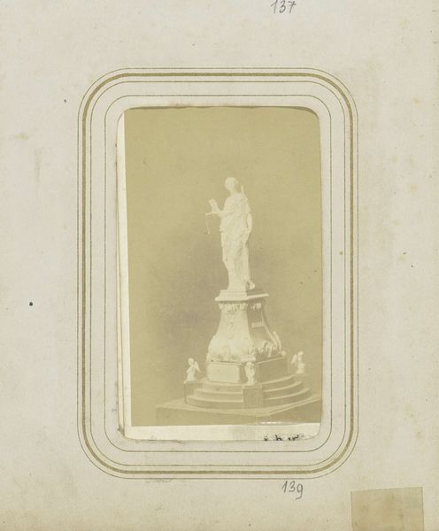 Editor: Here we have "Ontwerp voor het Nationaal Monument," or Design for the National Monument, from 1864, an early photograph showing a proposed monument by Maurits Verveer. It's so sepia-toned it almost feels like peering into a dream of the past. The monument itself has such strong Neoclassical elements, but captured in this way it has a subdued feel. I’m really curious about the concept for this monument. What do you make of it? Curator: Ah, yes, this photo print holds more stories than one might initially guess! It is an albumen print of a photograph showing a design model. That immediately says something about Verveer’s intention – that this would be his grand and public sculpture to commemorate independence, freedom, the making of a nation. It strikes me that it incorporates elements that had become symbolic figures that stood for key virtues. But instead of stone and bronze, we see it presented through the relatively new medium of photography, lending it both a timeless grandeur and a touch of modern ambition. Does that contrast strike you at all? Editor: It does. It’s like he’s using cutting-edge tech to propose a monument rooted in historical symbolism. How would people at the time reacted to a statue representing such classical themes of patriotism? Curator: I wonder! It is impossible to place yourself into the mind and assumptions of someone at the time. Neoclassicism at that moment signified order, reason, the ideals of the Enlightenment. What is so remarkable is its aspiration toward universal values through deliberate symbolism. But it's equally fascinating to ponder if such noble aspirations were accessible, meaningful for everybody, especially ordinary people just trying to live their daily lives. Editor: So it makes you think about the relevance of monuments, even today, and how they relate to the values of the public. Curator: Exactly! The design is a portal into a time of huge political, artistic change but it asks questions about representation and power. Even today.