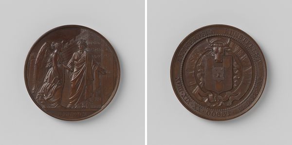 This is a bronze medal by Salomon de Vries, commemorating the third centenary of the capture of Brielle. It was made in 1872. The medal commemorates an event from 1572, when the Watergeuzen, rebels against Spanish rule, captured the city of Brielle. This event is seen as a key moment in the Dutch struggle for independence. The imagery on the medal is revealing. On one side, we see allegorical figures representing the Netherlands. A young woman stands with a Dutch lion, symbolizing courage and strength. Next to her, an angel raises a torch, representing liberty and enlightenment. On the reverse, the Dutch coat of arms is displayed, a powerful emblem of national identity. This medal is not just a historical marker; it's a statement about national pride and identity. It invites us to reflect on how societies choose to remember and celebrate their past, and how these memories shape their present. It prompts us to consider the complex relationship between history, identity, and power.