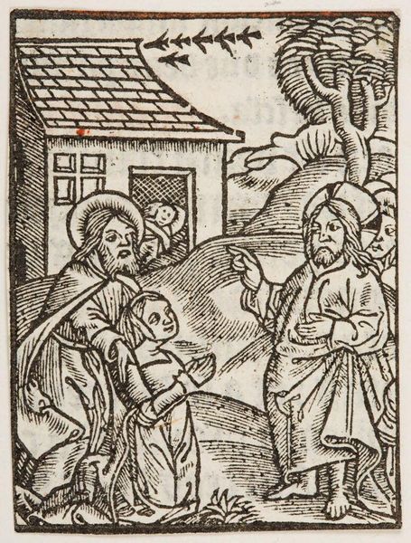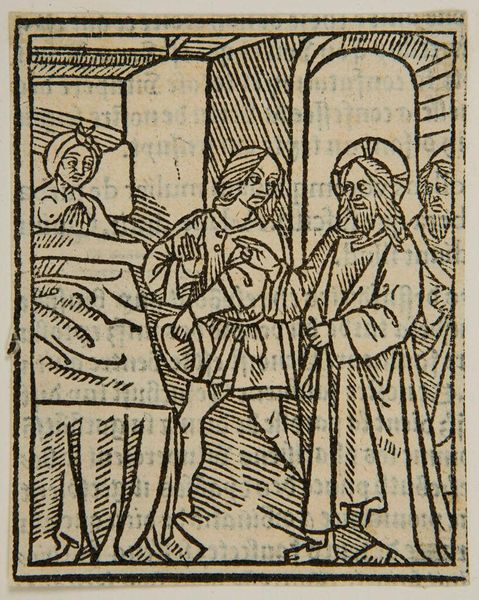 Editor: This anonymous woodcut depicts the Presentation of Christ in the Temple. It has a very simple, almost austere quality. What stands out to you? Curator: Notice how the artist uses linear patterns. These aren’t just decorative; they’re symbolic. The repeated lines create a sense of visual rhythm, evoking the ritualistic nature of the Presentation. Does that resonate with you? Editor: Absolutely. It does feel very formal and symbolic. The halos, for instance. Curator: Exactly. The halos are visual cues. They immediately communicate holiness and divinity, key to understanding the scene's cultural significance. And the child’s placement...what does that suggest to you? Editor: That he’s the center of attention, obviously, but also vulnerable, I guess? Curator: Precisely. The vulnerability highlights the promise and the prophecy surrounding him. It is a powerful visual statement. Editor: I see it now. The symbols carry so much meaning. Curator: They do, and understanding them enriches our appreciation of the artwork and its historical context.