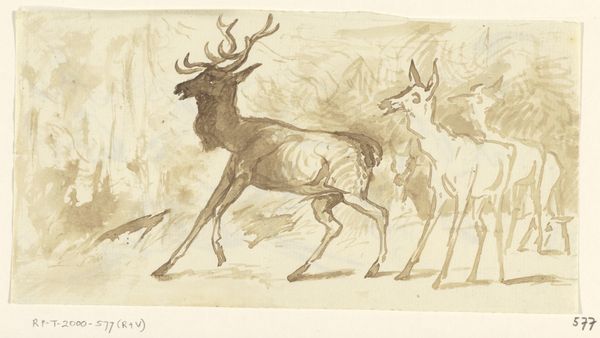 Editor: Here we have "Two Fighting Stags," an engraving made sometime between 1768 and 1813 by Samuel Gränicher. It's rendered on toned paper. I’m struck by the intensity captured in such a small-scale piece. The lines create a real sense of movement and aggression. What structural elements do you observe in this engraving? Curator: I appreciate your observations. From a formalist perspective, I find the interplay of line and form most compelling. The engraver’s meticulous cross-hatching not only defines the musculature of the stags but also establishes a textural contrast between their bodies and the relatively sparse ground. The dynamic pose, a near-perfect symmetry mirroring the conflict, generates an unsettling yet visually arresting composition. Do you perceive a balance, despite the evident chaos? Editor: I see what you mean about the symmetry, now that you mention it. They mirror each other almost exactly. The lines are very close and tight together and that definitely shows the tension between the animals and in the work. Curator: Exactly. Notice also the economy of line in depicting the landscape—a deliberate choice, focusing our attention squarely on the stag’s engagement. How do the structural choices contribute to its overall aesthetic impact? Editor: The more simple, open background almost highlights the complex shapes and textures of the bucks. It forces the eye to look closely. It feels raw, somehow, even for a landscape. Curator: Precisely. It's the calculated manipulation of form and line that elevates the engraving. Editor: This focus on pure visual elements offers such a different way to appreciate art, looking past possible historical context. Thank you! Curator: A rigorous analysis, I think, unearths an inexhaustible wealth of material. A pleasure, indeed.