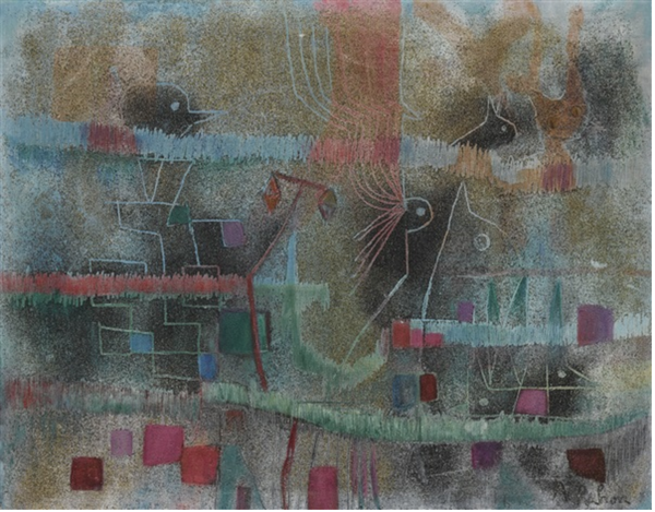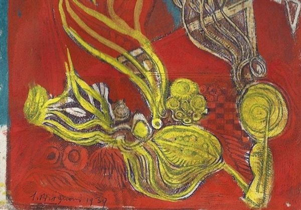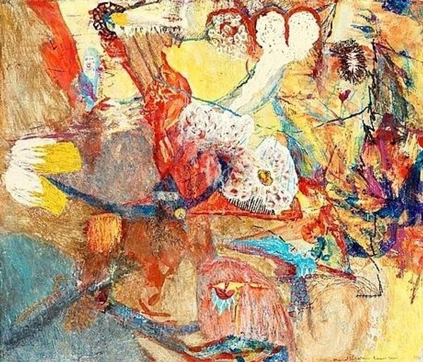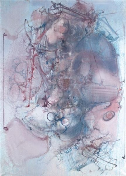Erol Akyavaş made this work, Alma Ausente, with a delicate, almost ghostly touch. The colours are muted – lavenders and greys – creating a hazy, dreamlike atmosphere, and the making looks like a search, or a quest. The surface is scrubbed and layered, with thin washes of paint building up a complex, textured ground. There's a real sense of the materiality of the paint; you can almost feel the brushstrokes and the way the pigment has been worked into the canvas. Look at the spindly lines that reach down from the central form, almost like roots searching for purchase, or maybe drips, the work feels delicately balanced between order and chaos, abstraction and figuration. It reminds me a bit of some of the early abstract expressionists, like Philip Guston, who were also grappling with how to represent emotion and experience through pure form. Ultimately, this painting remains open to interpretation, inviting us to bring our own associations and feelings to the viewing experience.