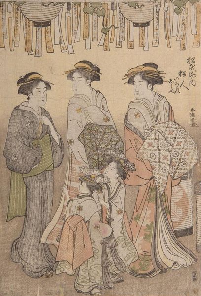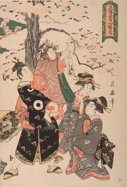 Curator: This is Kitagawa Tsukimaro's "BuyÅ Asukayama ShÅkei." Editor: It strikes me as dreamlike, the figures almost floating in soft color fields. The layering flattens the space beautifully. Curator: Indeed, the artist uses delicate line work to depict women, likely courtesans, in a procession—perhaps a festival. Note the objects they carry, suggesting ritual and status. Editor: I find the parasols and patterned fabrics speak to cultural codes of protection and presentation, highlighting societal roles through symbolic form. Curator: Precisely. The landscape above acts almost as a separate frieze, the light colors unifying the planes into a cohesive visual statement. Editor: Tsukimaro, with this piece, offers us a moment of quiet observation, a glimpse into the subtle performances of identity. Curator: An elegant composition worth further study.