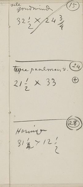 Curator: What strikes me first is the utter mundanity. It's just a page torn from a sketchbook. Scribbled notes, almost like a grocery list, really. Editor: Precisely! Though that surface simplicity belies a great deal, doesn't it? We're looking at a page from Gerrit Willem Dijsselhof's "Notities over kunstwerken," created sometime between 1876 and 1924. It's a mixed-media piece – drawing in ink on paper – housed right here at the Rijksmuseum. Curator: Yes, but look at the marks themselves! The interplay between text and number. The artist's hand so clearly present in the variations of line weight and the almost rhythmic repetition of forms. Semiotically rich, wouldn’t you say? Editor: I would indeed. And from a historical point of view, these notes are like little time capsules, offering insights into Dijsselhof’s creative process. Think of the exhibitions planned, perhaps, or the commissions considered. These sizes he notes are almost definitely for upcoming painting projects! Curator: The arrangement of the page itself creates a visual hierarchy. The boldness of certain notations… it begs the question, what was most important to the artist at that particular moment? Which, in essence, shows how all his potential commissions will work well as part of a larger composition? Editor: Exactly, or rather, it poses questions *for us*! These aren't pronouncements but records, open to our interpretation. Moreover, its placement within the Rijksmuseum transforms a private document into a public artifact. The politics of display subtly elevate the everyday, imbuing these commonplace notations with an unexpected significance. Curator: Ultimately, its impact lies in the raw intimacy it provides. One gains privileged access to an artist's mind as it is unfolding. We are seeing an artistic genius play and scheme his way into bigger, more challenging artworks. Editor: An intimacy made possible by the institution. A testament to the role of museums in shaping how we understand not only the art but the artist. Thank you for allowing me to consider this humble-looking piece through your focused eye, it reveals something powerful about the nature of an artist. Curator: The pleasure was all mine. Sometimes the most seemingly minor objects are actually among the most resonant. The Rijksmuseum collection has such a wealth of artwork in store, to get people considering art in all aspects of life.