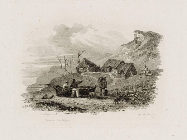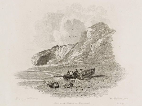 Editor: This is Peter De Wint’s "Scene on the Beach at Ventnor." It's quaint. What do you see in this piece that resonates beyond a simple beach scene? Curator: Notice the figures clustered in the boat. Boats often symbolize journeys, transitions. These figures seem paused, perhaps contemplating their next voyage. The looming cliffs, do they evoke a sense of protection, or are they a visual metaphor for challenges ahead? Editor: That's interesting, I hadn't considered the cliffs in that way. It makes me wonder about the symbolism of the birds, too. Curator: Birds frequently symbolize freedom, or even the soul’s flight. Their presence here, against the backdrop of the sea and cliffs, invites a deeper reflection on our own aspirations. What journey do you think of when you see this? Editor: I see how the image is speaking to cultural ideas of nature and exploration. Curator: Indeed. It's about how we navigate our inner and outer landscapes, guided by cultural memory.
