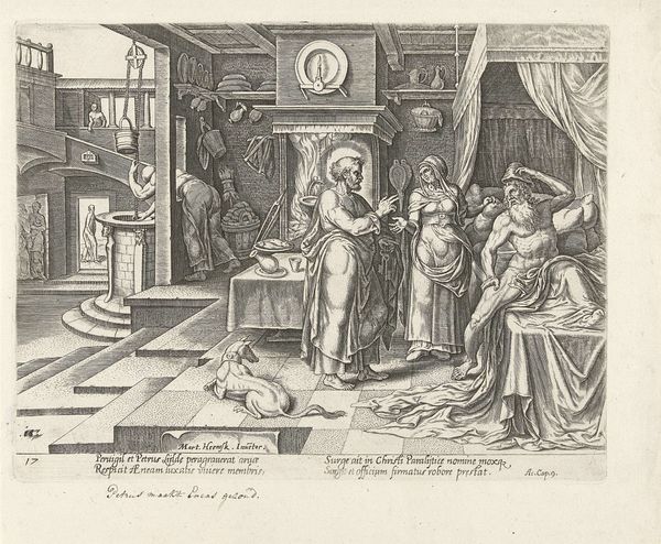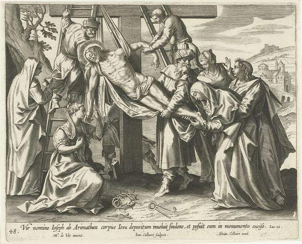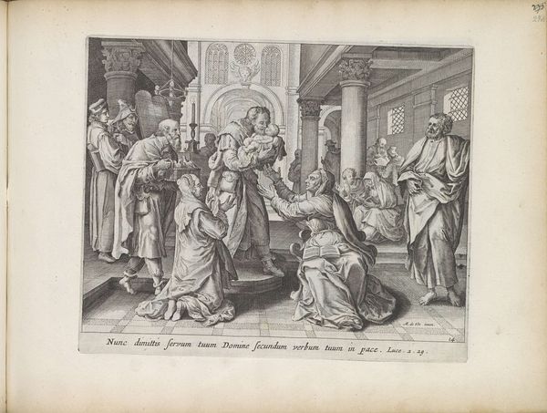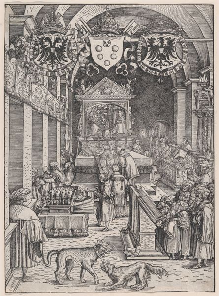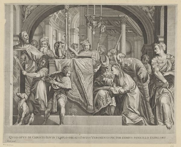 Editor: So, here we have Simon Frisius’s engraving, "Mass of St. Gregory," from between 1610 and 1630. It's incredibly detailed, almost overwhelming with figures. What do you see in this piece, in terms of its broader message? Curator: I see a carefully constructed image of power and the intersection of the spiritual and earthly realms, but not without critical commentary. Look at the placement of Christ. Isn't he depicted as if wounded, manufactured? It suggests an institution grappling with its own legitimacy amidst societal shifts. Editor: Yes, now that you point it out, Christ does seem almost like a… stage prop. I hadn’t thought of the image that way, but what societal shifts are you referring to? Curator: This piece comes from a period marked by intense religious and political upheaval—the Reformation, the Counter-Reformation, rising nationalism. What is Frisius trying to say by placing a wounded, manufactured Christ front and center during a liturgical celebration? It begs us to examine who benefits from perpetuating images of suffering, and the control exerted by religious institutions. Editor: It almost feels like a critique of the performative aspect of religion, with Christ as the ultimate symbol being wielded for political gain. Curator: Precisely! The very staging of the Mass – the grand architecture, the sheer number of figures present – speaks to a consolidation of power. How do you think the intended audience might have reacted to this image? Did it reinforce their faith or sow seeds of doubt? Editor: I hadn't considered the level of political commentary embedded in the art. The amount of scrutiny placed on power dynamics adds an entirely new depth to the work! Curator: Right, art doesn't exist in a vacuum, and it's by investigating it under the right sociopolitical scope that we reveal an artist’s position. Editor: Exactly. I am more motivated to visit the Metropolitan Museum of Art to further my education and delve deeper into Frisius' commentary!