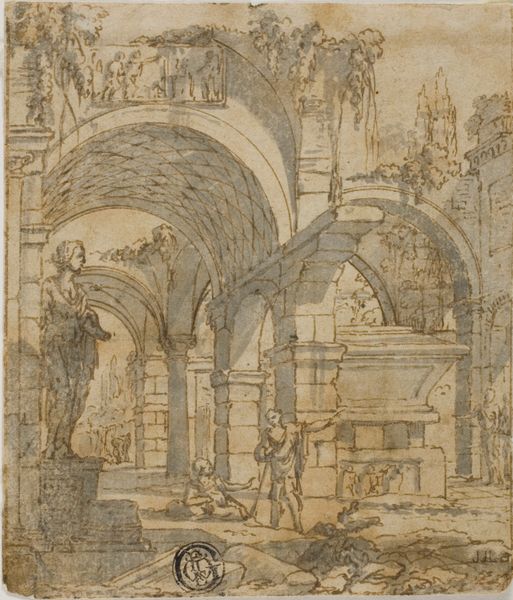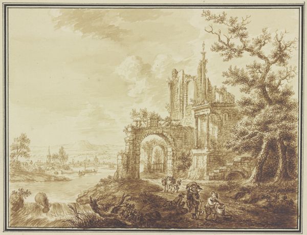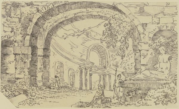 Cecilie Arens made this sepia drawing of a Portico in Ruins, sometime between 1750 and 1849. The sepia ink lends itself well to architectural subjects like this, as it mimics the faded grandeur of ancient structures. You see the warm monochrome palette of the ink washes, creating a soft, atmospheric effect, different from the precision and detail of a pencil or pen drawing. Sepia, made from the ink sacs of cuttlefish, was favoured for its tonal range and permanence. The application of the sepia ink, likely with brushes of varying sizes, allowed Arens to achieve subtle gradations of light and shadow, adding depth and volume to the architectural forms. The controlled washes suggest a mastery of technique, building up layers of tone to create a sense of atmosphere and decay. Arens, likely a woman working in the sphere of decorative arts, invites us to consider how materials and making contribute to our understanding of art and its cultural value.