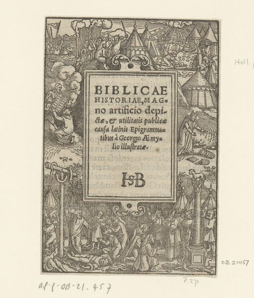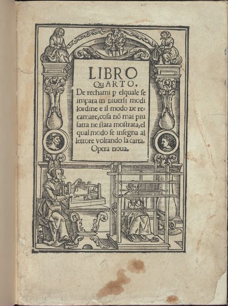 Curator: Here we have a page from “Convivio delle Belle Donne,” or "Banquet of Beautiful Women", dating back to 1532. It’s a woodcut, one of many pages from a book published in Venice by Nicolò Zoppino. Quite lovely, isn’t it? Editor: It's quite…stern, isn’t it? Almost austere. The heavy lines of the woodcut create a stark contrast on the page. The composition feels very formal, with that central image looking very... hieratic. There's an immediate sense of seriousness that really seizes you. Curator: "Hieratic" is a great word for it! The seated figure definitely holds a commanding presence. Notice the details in his robes and the pastoral staff; there is a real weight in those forms, beautifully rendered by the artist's skillful use of line. You feel you should bow before this powerful image. Editor: Absolutely, that contrast works wonders and almost evokes a sense of…submission, maybe even desperation from the other figure there. How does this narrative, this "Banquet of Beautiful Women," play into the historical and societal views of women at that time? Were these banquets actually inclusive and celebratory, or were they constrained by rigid patriarchal norms? Curator: Ah, context! Yes, this book, in its printed form, was likely consumed in intimate domestic settings by these very women. But it also circulated among literate men. As such, "Convivio" acts as an active reflection on the gendered discourse of conduct in the 16th century, at once reflecting and reinforcing prevailing views. Editor: Precisely. So even within the pretense of female festivity, what power structures and expectations were being subtly or not so subtly reinforced through works like this? How much agency were these women really afforded within these so-called convivial spaces? It is definitely thought-provoking! Curator: Yes, what's so interesting is the way such scenes were rendered with enough ambiguity to permit multiple readings. A kind of dance of suggestion and circumscription! In the woodcut, who is powerful and who is powerless depends entirely on one's cultural and aesthetic perspectives. That, for me, is what great art achieves! Editor: It reminds us how artworks from the past are not just aesthetic objects, but tangible reflections of the societal power dynamics and ongoing conversations. They carry historical echoes that need to be deciphered. It encourages us to keep the conversations going.