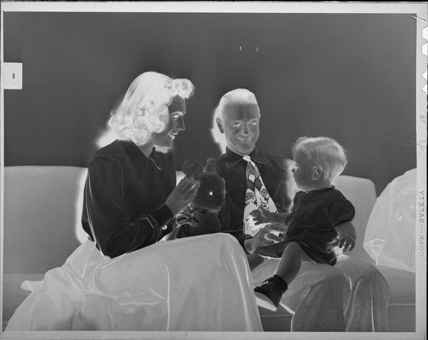 Editor: This interesting photogram, "Untitled (man holding baby)" by Lucian and Mary Brown, presents a reversed image of a domestic scene. The floral patterned chair strikes me. What can we learn about this piece? Curator: The reversed image emphasizes the chemical process of its creation. We see the labor involved, the photographic paper itself becoming the artistic medium. The floral chair also points to consumption patterns and domesticity of the era. Editor: So, the focus isn't just on the image but on the means of its creation and what the setting tells us about society? Curator: Precisely. The image content is almost secondary to the primary concern: the materiality and the production of the image as a cultural object. What does that make you think about the art itself? Editor: It gives me a new way to consider the image-making process. Thanks!