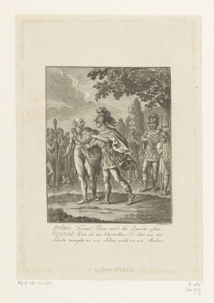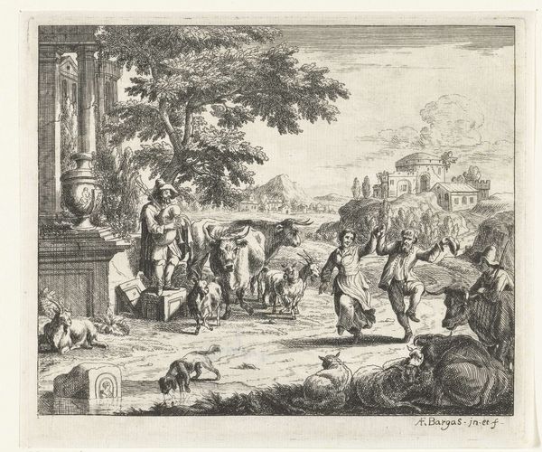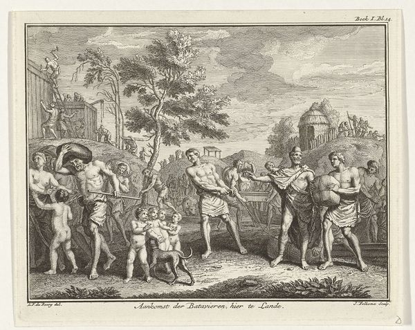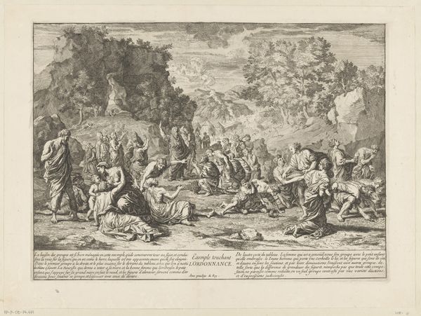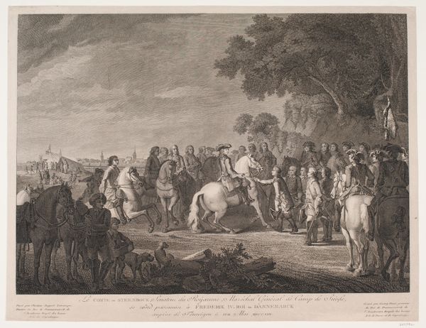 Editor: This is “Aderlaten van een paard” (Bloodletting a Horse), an engraving made sometime between 1708 and 1767 by Johann Elias Ridinger, currently housed in the Rijksmuseum. It’s a busy scene depicting what appears to be a medical procedure on several horses. I'm struck by the somewhat nonchalant way the figures seem to be approaching this act. How do you interpret this work within its historical context? Curator: The visual nonchalance, as you call it, is indeed striking. It speaks volumes about the power dynamics at play. Bloodletting, while a common medical practice for both humans and animals at the time, was also a demonstration of human control over the natural world. Editor: Control how so? Curator: Consider the social hierarchy embedded within this image. The figures performing the bloodletting are likely common laborers, while the people on horseback seem of a higher social rank. This suggests a stratified society where even medical practices reinforce existing power structures, doesn't it? It's not merely about healing the animal, but also about solidifying the owner’s status. The well-being of the horse is inextricably tied to the wealth and status of its owner. We must consider too the role of animals throughout history; this work serves as a case-study of how their very bodies have been tools of oppression, symbols of subjugation. Does this reading affect your perception of the work? Editor: It does! I was focused on the literal action, the bloodletting itself, but now I see it as part of a larger narrative of control. Thanks to your insights I understand more of the image’s deeper meaning! Curator: And I appreciate your careful looking! Thinking about works such as these forces us to critically examine humanity's ongoing relationship with the animal kingdom.