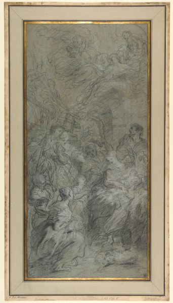 Curator: This drawing is Ciro Ferri's "The Death of Saint Francis Xavier," created between 1674 and 1679. What are your initial thoughts? Editor: It feels almost ghostly. The composition is dominated by the stark contrast of the dark, earthly figures with the airy angels above. A study in human suffering against divine presence. Curator: As a drawing intended for printmaking, Ferri had to consider how lines translated into reproducible images. The labor-intensive nature of printmaking at the time meant each stroke needed purpose and clarity to ensure effective reproduction and wider circulation of the artwork. Editor: Precisely. Look how the density of lines concentrates the eye. The heavier hatching around Saint Francis and those mourning creates a visual weight, drawing our focus downward, to the material reality of death. And above, the ethereal angels contrast sharply, a fleeting vision barely etched. Curator: And this echoes broader historical conditions, art playing an important role during this period in furthering specific socio-political agendas. Its baroque style emphasizes dramatic emotional impact for its intended audience. Editor: You're right, the overt drama reinforces the narrative, ensuring its message resonated across social strata. I keep being drawn back to the figure on the right, though – the raw emotion. It's fascinating how that level of sentiment is portrayed within this structured composition. Curator: Think of the conditions that influenced its creation. Patronage certainly determined much. An institution of considerable significance, for example, would naturally influence Ferri's style, use of religious motifs, and even production pace. Editor: A vital aspect of its meaning that context. Viewing it today, though, as lines on paper, removed from its original social setting, lets us contemplate the universal theme of mortality—something Ferri powerfully evokes with his skilled arrangement of form and light. Curator: It is a layered work, technically adept, with an understanding of historical context as being necessary for complete comprehension. Editor: Yes, its composition offers a glimpse into both artistic technique and broader human experience, making the experience deeply personal and moving.