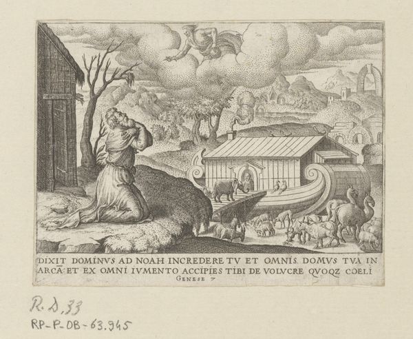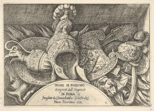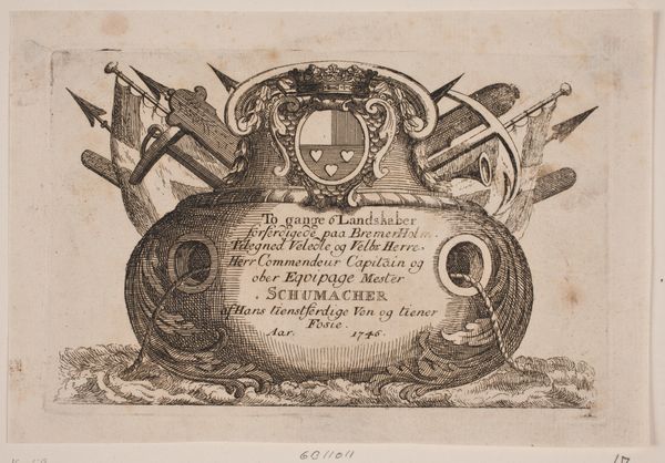 This small etching was made by Jonas Haas, probably in Copenhagen in the mid-18th century, and it's titled "Denmark and Norway's Economic Magazine." The image is a vignette, intended as a heading or tailpiece to a publication. We see a formal garden, neatly laid out with potted trees and rows of candles. In the middle ground a fountain rises behind some flourishing tall grasses. A hand emerges from a cloud in the upper left, pouring water on the grasses. Above, on a banner, the Latin motto “Dat Pluribus Una,” or “One to Many.” The image and the title of the magazine suggest a certain self-image on the part of the Danish state, which at the time included Norway. It suggests a careful cultivation of the land and a focus on economic growth. But it also proposes that the state can shower its riches on many people at once. To understand this image better, one could research the economic conditions in Denmark and Norway at the time, looking at how wealth was distributed and how the state managed its resources. We might also consider the relationship between the Kingdoms of Denmark and Norway and how the magazine relates to their social contract.