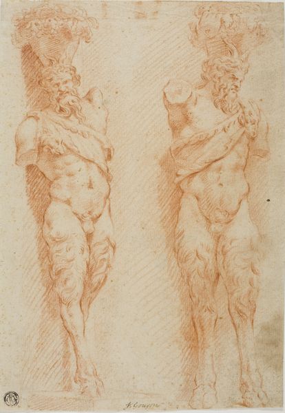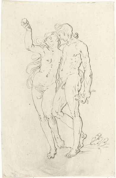 Curator: This drawing, "Adam and Eve," is by Abraham Bloemaert. Executed in red chalk, it's currently held here at the Städel Museum. Editor: It has such an immediate intimacy, despite the grand subject. The red chalk lends a softness, almost a vulnerability, to the figures. The composition, with Eve’s raised hand, draws the eye upwards, while Adam's pose seems more contemplative. Curator: The use of red chalk in preparatory drawings like this points to its affordability and workability as a medium accessible within the artist's studio. Bloemaert's choice also allowed for efficient execution, enabling quick revisions and refinements during the conceptual stage, essential for workshop productivity. Editor: The materiality of the red chalk grants it this immediacy as a Renaissance figuration. Bloemaert focuses on anatomical precision. Note the intricate cross-hatching, particularly on the musculature, to give it volume and form. Curator: I agree. The material properties invite an appreciation of artisanal labor, and Bloemaert came from a family of artisans involved in trades from sculpture to architecture. And, more widely, consider the socio-economic dimensions related to artistic skill acquisition during the Italian Renaissance; this impacted an artist’s social positioning. Editor: What I see is Bloemaert’s command of Renaissance conventions to structure the composition—this precise rendition. Consider, for instance, how the use of shading is handled so effectively here, highlighting a certain corporeal presence. Curator: Yes, and we can link the consumption of drawings like these, often serving pedagogical aims within artist workshops. Their market function facilitated a broad distribution and appreciation, democratizing art making, since artisanal modes and studio practices intersected the demand of elite circles for religious themes rendered by skilled practitioners. Editor: Right, yet for all its grounding in production, it achieves this remarkable expression. The lines suggest this tension that exists between their figures and Eden itself. Curator: Seeing these intertwined roles reminds us that even the most seemingly transcendent art emerges from practical skills, social conditions, and systems of exchange. Editor: Agreed. Ultimately, both the aesthetic and the material come together to offer us, the viewers, such a reflective portrayal of humanity.