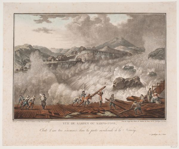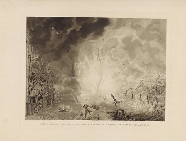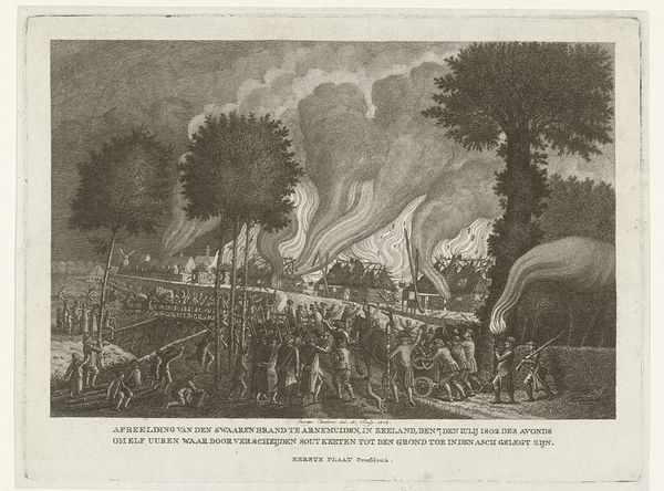 Curator: What a striking image. We're looking at "Fire in the Steppe," a watercolor and coloured pencil work completed in 1848 by Taras Shevchenko. Editor: My initial impression is the overwhelming intensity of the fire, those bright oranges really dominate the composition. It’s unsettling to see it stretch across the horizon like that. Curator: Indeed. Shevchenko, despite being renowned as a poet and advocate for Ukrainian national identity, found himself exiled and serving in the military in the Orenburg region of Russia at this time. This work reflects the realities and potentially the unease of that period. The Romanticism apparent in its style may emphasize personal feeling at odds with this social environment. Editor: The formal composition is interesting. There’s the stark contrast between the raging fire consuming the upper register of the work, then that much cooler and calm lower section, it almost seems to act as a barrier to protect those figures in the foreground from the advancing threat behind. Curator: I'd agree. The presence of people adds a narrative dimension. Notice their encampment near the water and the lone figure riding towards the blaze – are they fleeing, investigating, or is this just a routine aspect of life in the steppe? It makes you wonder what this type of uncontrolled conflagration may mean to the social fabric of that region, especially with Shevchenko's unique socio-political context in mind. Editor: The colour palette is so effective, I am immediately drawn to the dynamic push and pull created between the warm oranges of the flames and the contrasting muted blues of the sky that sits beyond the horizon. Curator: Well, I agree, it all converges to remind us of the interplay between individual and environment. This image resonates both visually and with his struggle for cultural and national expression amid challenging conditions. Editor: A dramatic work indeed, with colours and composition creating an impressive dichotomy that I'll consider further on my walk.