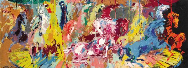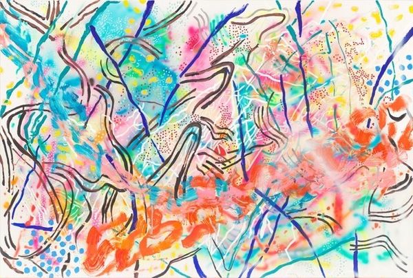 Editor: Jean Messagier's "Machine pour Toulouse Lautrec," from 1991, created with acrylic paint, strikes me as incredibly energetic. The bright colors and frantic brushstrokes create a sense of restless movement. What do you see in this piece? Curator: What interests me is the title: "Machine for Toulouse-Lautrec". Immediately, I start considering the *means* by which this image was made. How does Messagier conceive of his practice in relationship to an artist known for chronicling nightlife? Was Messagier using a process to depict a certain culture, just like Toulouse-Lautrec did? Editor: That’s a really interesting point, how the "machine" aspect intersects with culture. Is he suggesting a kind of mechanical, reproducible aspect to Toulouse-Lautrec's subject matter? Curator: Precisely! Think about the context of 1991, and acrylic paint itself. Acrylics allowed artists increased options of production at greater volumes. Are the vibrant colors an attempt to highlight accessibility? It's almost a mechanized or industrialized approach to Fauvism’s use of bright color, made readily available. Editor: So, you're focusing on the industrialization of art production as a key element of this piece and maybe making a comment on cultural availability. The brushwork appears gestural and personal. Does that fight against your "machine" interpretation at all? Curator: Not necessarily, because it speaks to a different sort of labor. Think about the artist, wrestling with the new industrialization of their medium to create authentic marks within a context dictated by industry and capital. It speaks to the consumption of both materials and the Fauvist style. The line work too may reference older artistic styles rendered on a larger scale. Editor: I never would have considered this painting from that perspective! Considering it in the context of material accessibility and mass production gives me a whole new appreciation for it. Thanks! Curator: Glad I could help to illuminate this artwork, viewing its material and production choices opens a new lens of interpretation and also reminds us to always look for that reference of material.
