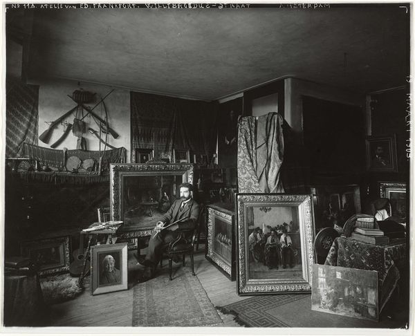 Curator: "Janet Gaynor and George O'Brien in Sunrise," a gelatin silver print, created circa 1927. The photograph captures actors behind the scenes. Editor: There's a captivating tension between staged artificiality and authentic presence, wouldn't you say? Curator: Precisely. Let's examine the production setup—the lighting apparatus, the backdrop supports—all unveiled to the viewer, it’s raw and utilitarian. Editor: Exposing the infrastructure behind these idealized images of movie stars destabilizes any illusion of effortless celebrity. The photographer's presence also plays a significant role. They weren’t invisible in this era. Curator: Note the massive camera. Photography in the early 20th century wasn't instantaneous, think of the labor involved—handling bulky equipment, mixing chemicals, printing the images. Each print represents hours of physical engagement. Editor: And what about the representation? This work really underscores the idea that images are constructed. Think of Janet Gaynor and George O’Brien within the silent film era. They represent shifting gender roles—O'Brien in his sturdy suit, while Gaynor seems ethereal. These performers had power. The image suggests the larger machinery behind building the stardom itself. Curator: How interesting that the picture exposes its means! This is what fascinates me most—the tools themselves become central to the art. It underscores that creating and marketing actors required just as much artistry as performance. Editor: Right, stardom is created labor, it does not just magically exist. This candid framing lets the viewer into the business of image making—all while hinting at their evolving relationship. We can read it today as the very genesis of modern celebrity and its costs. Curator: Absolutely. It shows us the materials and working conditions that have shaped modern popular culture. Editor: A compelling snapshot of performance, production, and the slow-burn construction of what we consider 'real' within popular media.