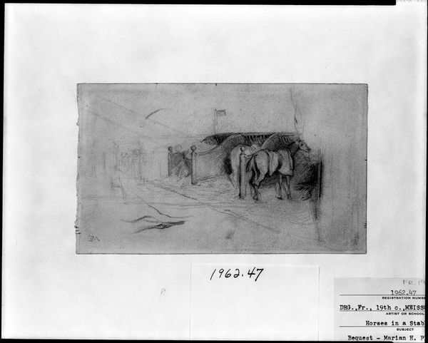 Editor: This is William Rimmer's graphite drawing, "Soldier and Horses Before a Shrine." It's quite small, but the composition is intriguing. What do you make of the architectural structure juxtaposed with the figures? Curator: I find the sketch compelling in its use of line. Notice the artist’s deliberate choice to use a limited range of tones, creating depth through variation in line weight. The composition, while asymmetrical, achieves a certain dynamic balance. Editor: Balance through asymmetry, that's interesting! Curator: Indeed. The tension between the detailed shrine and the more loosely rendered figures creates a visual push and pull. This tension enhances the viewer's experience, prompting a deeper look at the composition. Editor: I'm starting to see that. Thanks for pointing out the lines and how they direct the eye. Curator: You're welcome. Sometimes the simplest forms reveal the most complex relationships.