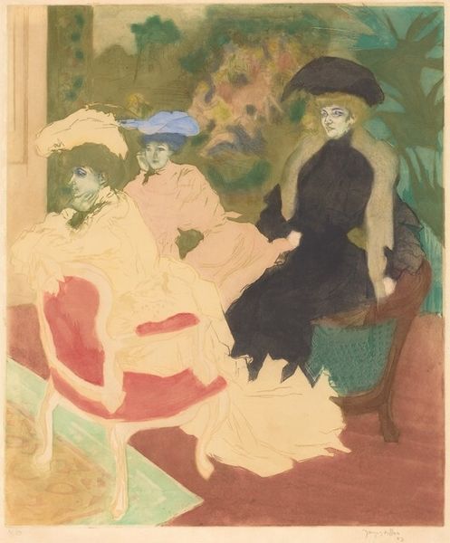 Editor: This is Edvard Munch's "Street Scene at Night," currently housed at the Harvard Art Museums. I'm really struck by the contrast between the vibrant dresses and the shadowy figures behind them. What do you see in this composition? Curator: The chromatic arrangement establishes a compelling dialogue between visibility and concealment. Note how the light, seemingly artificial, isolates the figures in the foreground, rendering the background as an almost impenetrable mass. The interplay of colour creates tension. Editor: That's fascinating! So, the structure and the colors are actually creating that mood? Curator: Precisely. The structural organization, together with the limited palette, invites us to consider the semiotics of space and form. What do you make of their gaze? Editor: I hadn't considered that! I'll definitely be thinking about that on my way home. Curator: Indeed, it offers much to contemplate beyond initial impressions.