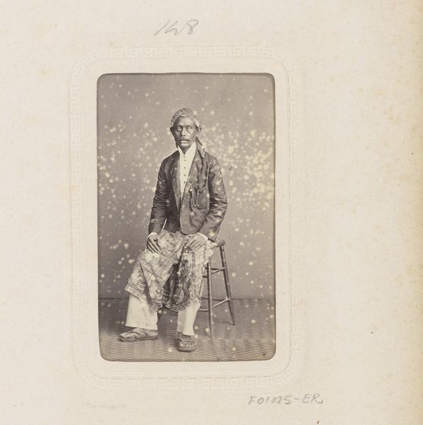 Editor: Here we have Woodbury & Page's photograph, "Portret van een zittende, Indonesische man," dating from somewhere between 1857 and 1880. I’m really struck by the materiality of this early photographic print and its rather formal presentation. What strikes you about this image? Curator: I'm interested in how this photograph operates as both a portrait and a document of colonial labor. Consider the patterned cloth the subject is wearing – likely batik. It's not simply a background detail but a product, a commodity, and a symbol of Indonesian artistry. Editor: So you’re suggesting the batik has social and economic implications here? Curator: Exactly. The means of production – the labor, the materials – all contribute to understanding the relationship between the photographers, the sitter, and the broader context of colonial trade and cultural exchange. Who produced that batik, how was it traded, and what value was placed on it? These are crucial questions when interpreting this image. Editor: That’s a good point! I had only considered it as a decorative element. Curator: The very act of photographing was itself a technological process, importing Western technology and aesthetics. The material history of the image itself – the paper, the chemicals used in processing – tells a story of industrialization and global trade. How did these photographers learn their trade, what materials did they have access to, and what impact did that have on their subject? Editor: Looking at it that way really does change how I see it! Thank you for this insight! Curator: Thinking about art through materials and their histories always deepens my understanding, and I hope it did for you too.