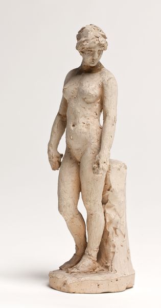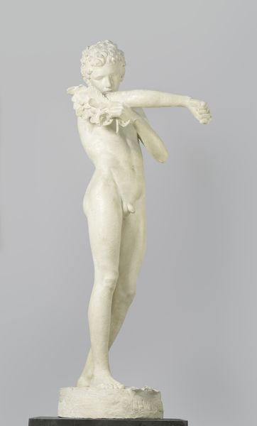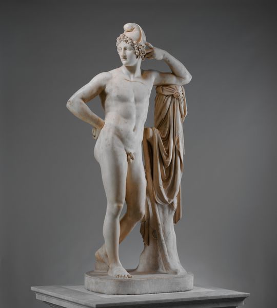 Editor: We’re looking at the marble statue of the Diadoumenos, or youth tying a fillet around his head, created sometime between 1 and 199. It’s currently held at the Metropolitan Museum of Art. The fragmented statue embodies grace but, being incomplete, feels frozen in time. What symbolic layers can you unpack for us in this depiction of youthful athleticism? Curator: The act of tying a fillet – a band of victory – transforms the athlete into a living embodiment of triumph and order. Beyond the simple physicality, consider the implied cultural memory; the statue immortalizes an idealized youth, linking back to generations past and those yet to come through the celebration of athleticism and civic duty. The tree trunk is no mere support, it represents a primordial connection to nature. It echoes earlier imagery associating male youth with an untamed wilderness now brought into civic order by athleticism. What aspects of cultural identity do you think the image emphasizes? Editor: It definitely celebrates idealized masculinity, strength, and perhaps the discipline required to achieve victory. Curator: Precisely. The lack of dramatic musculature, contrary to later eras, emphasizes the poised mind capable of calculation rather than raw power. So how would you compare it with today’s athletic representation in your opinion? Editor: Today, athletic representations tend to highlight exceptional physical strength. This is a marked difference compared to the Diadoumenos, which celebrates balance and measured self-control. It speaks of societal values and the changing notions of physical and mental fortitude across ages. Curator: It does indeed. Cultural continuity manifests as a reimagining, a constant re-negotiation with symbols of the past. What a poignant dialogue the sculpture enables with bygone and modern generations!