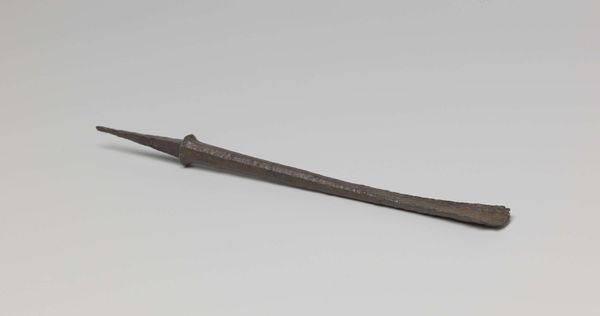 This fragment of an object is held in the Rijksmuseum. Its linear form and subtle texture give a sense of its past use, but also intrigue us to contemplate its fragmented state. We can see a simple tool, perhaps for carving or marking. One end features a grooved edge, while the other is flat and rectangular. What strikes us is the linear directionality, inviting the eye to follow its length. The material, possibly metal, is patinated. This lends a sense of age and history. The texture indicates that this tool was once held, used, and subjected to various forces. The anonymity of its maker and the ambiguity of its function leave room for interpretation. This elevates its status beyond a mere utilitarian object. It makes it a symbol of human innovation. This object stands as a testament to the countless untold stories of creation and labor.
