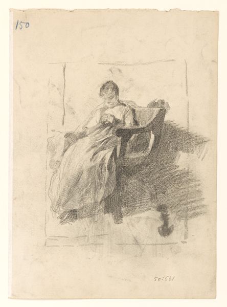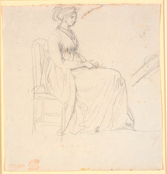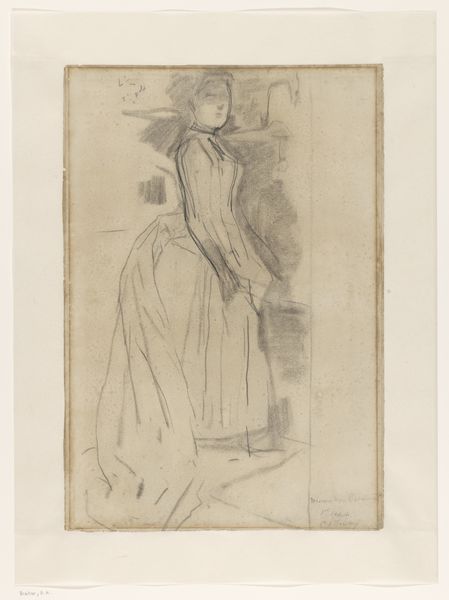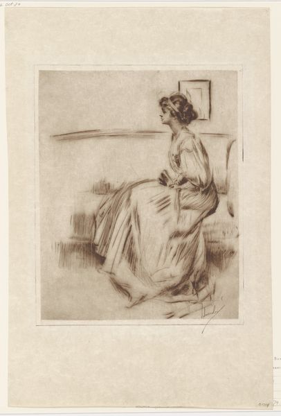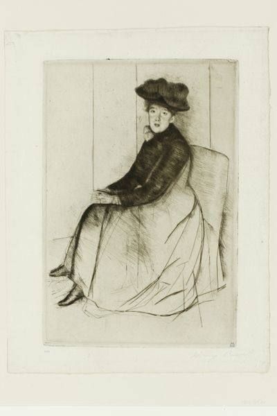 Curator: What strikes you first about this etching, The Mandolin Player by Mary Cassatt, dating to around 1889? Editor: The simplicity. There's a stillness evoked by the delicate lines and the restricted tonal range. It feels very intimate and contemplative. Curator: That intimacy aligns with Cassatt's frequent portrayal of domestic scenes. What’s crucial to note is the etching process itself. Observe how Cassatt used this method to mass-produce art, making images and commentary on modern life available to the middle classes. Editor: I see your point. But let’s not disregard the careful composition here. The figure fills the frame, but there's breathing room, particularly around her head. It allows the eye to travel and to consider the form created by the repeated parallel lines in the skirt. Curator: Precisely. Her focus on clothing hints at social structures. Consider the textiles, where those garments originate, and who bears the economic responsibility to supply those material components for the clothes depicted in the drawing. This piece embodies how societal values penetrate private spheres. Editor: It also exemplifies the influence of Japanese prints on Impressionist artists. Notice the flattened perspective, the elegant simplicity, and the subject. The very suggestion of space in that area behind her with just a few subtle markings. The scene exists for what she provides there visually and the mood she conjures. Curator: And the mandolin suggests more than just a musical instrument. Cassatt subtly comments on women's limited roles, reduced sometimes to providing background noise in upper class families, like this character, rendered available by class and the Industrial Revolution that formed the materials needed to fashion this scene. Editor: It’s hard to see such a limiting scope through Cassatt’s own legacy. This image, to me, reveals more of her vision than the subject's own circumstance. There is, again, her eye. Curator: Ultimately, this etching speaks volumes about the socio-economic landscape of Cassatt's era, even when you consider that the piece does function as more of an aesthetic presentation rather than outright critique of the era it occupies. Editor: I see it too. And regardless of the circumstances Cassatt sought to uncover, her technical ability still holds true in this evocative, and incredibly composed piece.