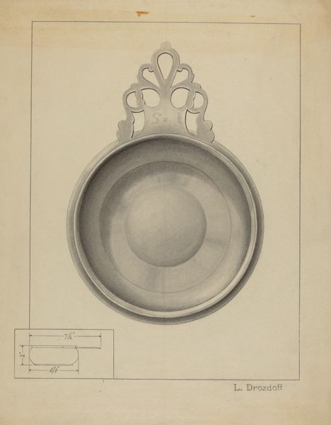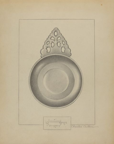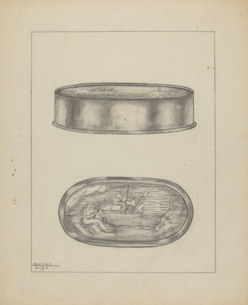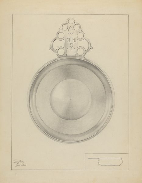 This is a detailed drawing of a silver box, created by Sara Garfinkel. The drawing captures the form and sheen of the silver, emphasizing its smooth, reflective surface. The design is simple, yet refined, with an oval cartouche that features an elegant monogram. Silverware like this was often associated with wealth and status, but it also relies on the labor of skilled artisans to bring it into being. Consider the processes involved in crafting such an object: the refining of the raw metal, the hammering and shaping, the delicate engraving. Each step requires careful attention and expertise. While we might admire the finished product for its beauty, it’s important to remember the amount of work that went into it, and its original function as a repository for valuables. Paying attention to materials, making, and social context allows us to appreciate the full meaning of an artwork, challenging traditional distinctions between fine art and craft.