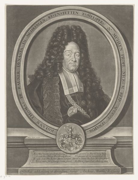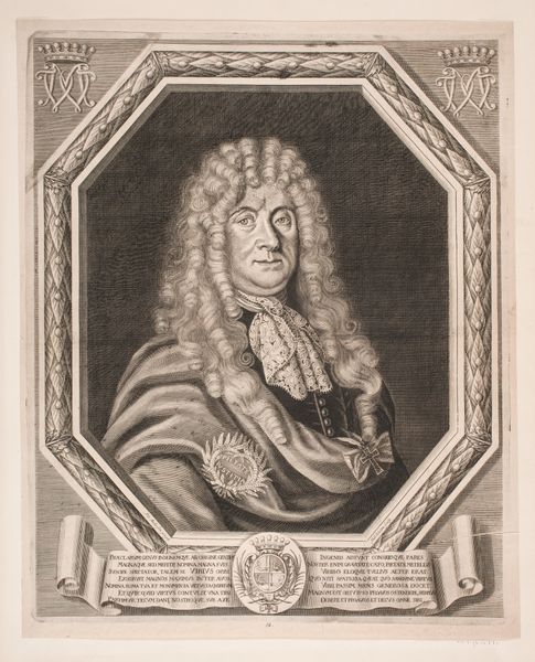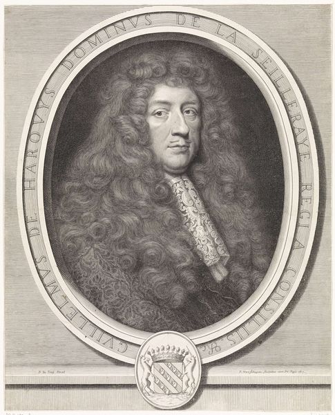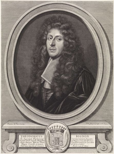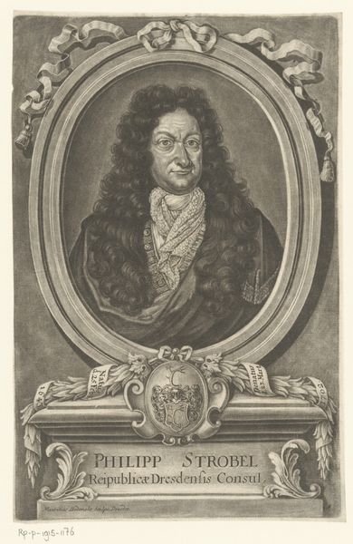 Editor: Here we have Pieter Schenk’s “Portrait of Gerhard Schott,” made sometime between 1670 and 1713. It’s an engraving, and something about the detail in his hair feels so striking, especially framed like that. What draws your eye in this piece? Curator: It’s the symbols, isn’t it? Look closely at the oval frame—it’s not merely decorative. Consider the shape: the egg. In many cultures, that symbolizes potential, rebirth. The curtain above hints at theatre, or revelation. He isn't just a man; he's a figure presented on a stage. What does the tasselled rope to the side signify to you? Editor: I hadn’t considered it as a stage… The rope maybe signals power, or status? Curator: Precisely! And below him, the plinth. It’s stone – signifying permanence, grounding. On it we see his coat-of-arms and inscription: Gerhardus Schott, senator of Hamburg. It all coalesces: ambition, civic responsibility, enduring legacy. But let's think about what isn't shown, too. Editor: That's true. It makes me think, what's concealed behind those symbols? Curator: What might his portrait reveal to those who saw it then, in terms of Hamburg's societal values or the sitter's place within it? Editor: I see it now—the image isn't just about Schott as a man, but about him as a representation of power within the city itself! The symbols build up layers of cultural meaning and tie him to Hamburg. I hadn't realized how much symbolism could be embedded in something that seems like a straightforward portrait. Curator: Exactly! Symbols always tell a more nuanced story if we take time to consider all meanings.