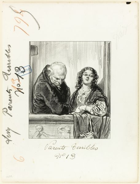Editor: This lithograph is titled "Les-Parents-Terribles series: Come, come a ball's always the same," made by Paul Gavarni in 1853. It's part of a series, and I'm immediately struck by the contrast between the youthful woman and the much older man. There’s a tension in their proximity, and the details in the clothing versus the bare background feels intentional. What are your initial thoughts on this work? Curator: Considering its production, we must delve into the lithographic process itself. The ability to mass produce prints like these changed art consumption drastically. This work speaks to the changing social landscape of mid-19th century France. Think about the paper, the ink – these were commodities, circulating within a burgeoning capitalist system. How do you think Gavarni's choice of lithography, rather than say, painting, reflects on the work's intended audience and message? Editor: I hadn’t really considered the implications of lithography itself. Painting feels more individual and precious. So, mass-produced prints reach a broader, probably middle-class, audience. This makes the image itself, the commentary on relationships, accessible and therefore maybe more critical? Curator: Precisely! Gavarni used readily available materials to craft his commentary. The ‘parents terrible,’ the challenging of familial roles, all becomes part of this material landscape. Are they truly “terrible”, or just victims of the societal and economic shifts occurring? Do you feel Gavarni is offering a critique, or simply mirroring a recognizable reality? Editor: It's hard to tell, maybe both? I was focused on the figures, but seeing it as part of a bigger system, with materials and labor... that definitely gives me a different angle to consider. Curator: Exactly, seeing the object not just as a picture but as a product deeply embedded in its time, alters the whole interpretive framework. Editor: Definitely. I appreciate seeing the social context woven into the material aspects; it adds layers to the image. Curator: And that enriches our viewing.