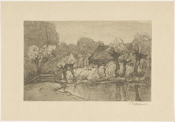 Elias Stark created this tranquil scene, ‘Geese by the Water,’ using etching, a printmaking technique, sometime before his death in 1933. This isn't just drawing; it’s a chemical and physical process that emphasizes the work involved in its production. The etcher coats a metal plate with a waxy, acid-resistant ground, then draws into that ground with a sharp needle, exposing the metal. The plate is then submerged in acid, which bites into the exposed lines. The longer the plate sits in the acid, the deeper and darker the lines will be. After the ground is removed, the plate is inked, wiped clean, and then pressed onto paper, transferring the ink from the etched lines to create the image. This print's charm lies in its delicate lines and tonal variations achieved through varying the acid’s bite. Each impression requires the artist to repeat this labor-intensive process, offering a vision of nature filtered through industry. It asks us to reconsider how we define artistic value, emphasizing skill, labor, and material transformation.