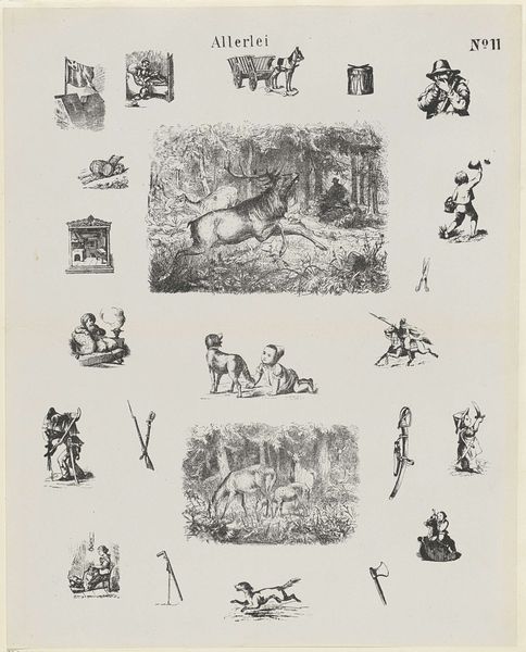 Victor Adam created this lithograph, "Seventeen Scenes from Daily Life with Various Human Figures and Animals," during a period of significant social and political change in Europe. Adam, working in the 19th century, captures glimpses into the everyday lives of people across different social strata. It seems that he was trying to depict a range of human experiences—from agricultural labor to domestic scenes—each carrying its own weight of cultural and societal expectations. The scenes showing figures interacting with animals raise questions about labor, class, and our relationship with the natural world. His choice to depict these scenes through lithography, a medium that democratized image production, speaks to a desire to represent and perhaps critique the broader societal landscape. While seemingly simple, these images invite us to consider the varied roles individuals play within their communities and the silent narratives embedded in their daily routines.