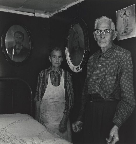 Curator: Here we have Milton Rogovin’s gelatin silver print, "Zimbabwe (Family of Miners series)" from 1989. What are your first thoughts? Editor: Stark. A quiet dignity emanates from this image of a couple standing close together. The grainy texture contributes to a feeling of lived experience. There’s something very raw about it. Curator: Rogovin was deeply committed to documenting the lives of working-class families. The image needs to be understood in light of colonial and post-colonial Zimbabwe, a history defined by exploitative mining practices that profoundly affected the workers’ lives. Editor: Absolutely. The woman, dressed modestly in a light colored dress, and the man, in what appears to be work clothes, could be seen to represent a generational challenge against racial capitalism. Consider the wall behind them plastered with news and magazine clippings which signal not just aspirations but a world far removed. Curator: Rogovin often photographed people in their homes or neighborhoods, framing them as subjects rather than objects. Here, that strategy presents the politics of representation head-on, particularly through its deliberate framing of the couple. I wonder how that approach may confront preconceived notions, especially with the family's connections to extractive industries. Editor: I agree. The photograph becomes a statement. They stand united and their quiet gazes challenge the viewer. Their hands, clasped together, become symbolic, hinting at the resilience required to navigate socio-political structures during the era it was created. Curator: It’s fascinating to consider the impact that the location of where and when these photographs are exhibited can shape audience perception, shifting understandings over time. Editor: Looking at the socio-historical perspective coupled with its striking visuals, this photograph transcends documentation to stand as a testament of strength, and of family, amidst very challenging circumstances.