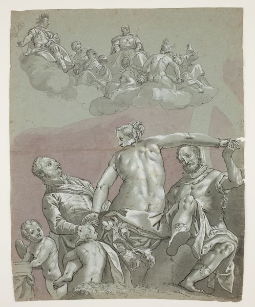Curator: Right now, we’re standing in front of Luca Cambiaso's drawing titled "Martyrium des Heiligen Bartholomäus, darüber in Wolken die Madonna mit Kind, zu beiden Seiten die Heiligen Johannes der Täufer und Lukas, links unten eine kniende Nonne" or in simpler terms, "The Martyrdom of St. Bartholomew". It’s currently held in the Städel Museum's collection, rendered with ink, pencil, and chalk. Editor: My initial reaction is…intense. The whole scene feels incredibly charged. The drawing seems to depict the grimmest scene, though softened a touch by the somewhat gentle touch of the artist. Curator: The composition definitely contributes to that feeling. Cambiaso was quite the draughtsman. Look at how he organizes the figures, creating a very strong contrast between the earthly violence happening to St. Bartholomew and the celestial figures looking down upon it. It’s almost like a visual representation of the divide between suffering and salvation, isn't it? Editor: Precisely. And, it really puts the viewer in an odd position. It’s hard to reconcile what you’re looking at—an act of horrendous brutality—with the kind, contemplative gaze of the Madonna. You want to look away, but then the promise of salvation compels you to hold steady. The sharp lines capture all the brutality. The faces in the crowd look evil and the saint is doing everything he can not to. It's as simple as this. Curator: Luca Cambiaso did excel at figure drawing and narrative compositions. As a history painting it presents a potent emotional narrative. His technique, you can see it throughout, feels almost mathematical at times, breaking figures down into geometric shapes. That may be one reason why his characters strike us as slightly unnatural. But, don’t you feel that somehow, it only intensifies the brutal reality playing out? Editor: I am seeing the geometrical constructs you just mentioned—now it becomes less and less of a mystery why this does feel as heavy to absorb, why so much torment seems to be bursting out of this artwork’s structure. The figures are carefully staged. The contrast between St. Bartholomew and those figures enacting such harm is strong, drawing your eye right to center before drifting to the crowd above the saint's head. In my case it looks more like he will take over everyone around. Curator: And look, the figure of the kneeling nun seems almost inconsequential, yet it anchors the viewer within a religious space. Her presence almost asks us to kneel, like her, in observance. Editor: Ultimately, for me, it's about how the artist portrays torture while at the same time, giving you something soft and holy. The formal rigor clashes directly with the brutal subject matter and, unexpectedly, creates a strong emotional reaction. Curator: Exactly. It's like a prayer illustrated on the page, or maybe an echo into Luca Cambiaso's own search to translate the emotional story through stark contrast between violence and grace. A captivating and complex piece that still speaks volumes.