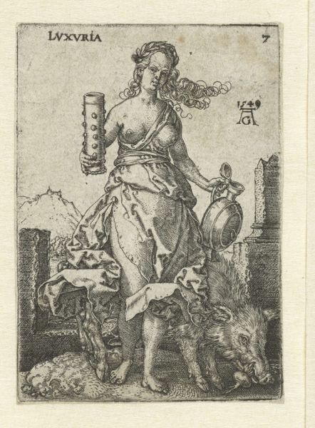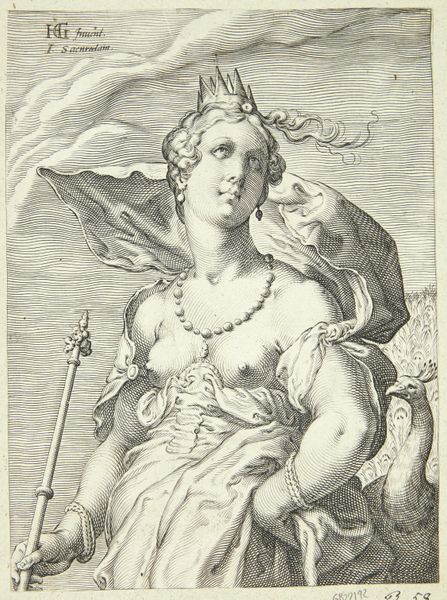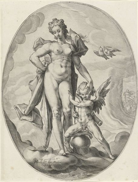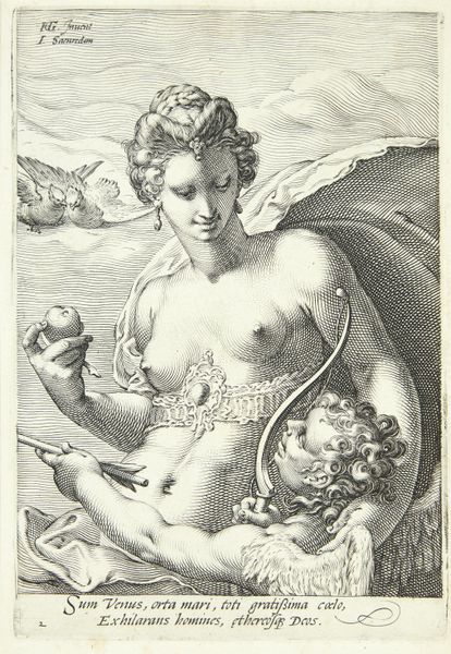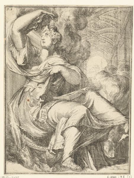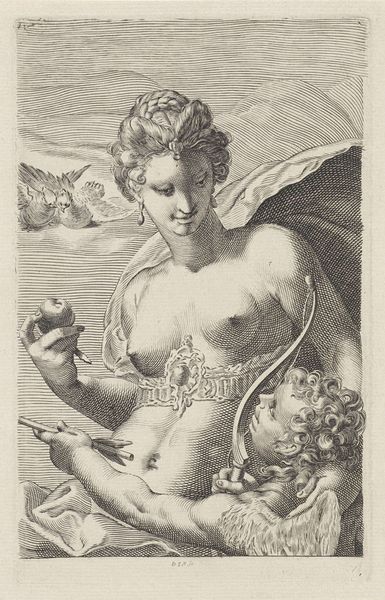 Jan Saenredam created this engraving of Pallas, the Greek goddess of wisdom and warfare, sometime between 1589 and 1607. Here, Pallas’s complex identity takes center stage, as the engraving invites us to consider the multifaceted nature of female power in the late 16th century. She’s armed for battle, yet her exposed breast hints at vulnerability, challenging the era’s strict gender roles. The inclusion of Medusa's head on her shield isn't just an emblem of victory; it's a potent symbol of transformation and protection. The owl, a symbol of wisdom, nestled in the clouds, complements Pallas’s identity as a deity of strategic thought. This Pallas isn't a mere reproduction of classical ideals. She embodies the complex negotiations of power, intellect, and vulnerability that women navigated during the Renaissance, inviting us to contemplate the nuanced layers of identity and representation.