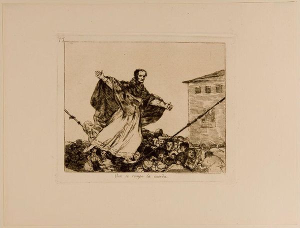 Editor: This etching, "Rabble" by Francisco Goya, depicts a violent scene with frenzied figures. It feels chaotic and intensely emotional. What symbolic weight do you think the image carries? Curator: The figures' poses, particularly the woman with the raised weapon, evoke ancient sacrificial imagery, while the crowd embodies primal, collective rage. Goya taps into deep-seated cultural memories of violence and retribution. Do you see how the blurring of individual faces contributes to this? Editor: Yes, it’s like the loss of individual identity fuels the collective violence. I hadn’t thought about the sacrificial aspect before. Curator: Goya masterfully uses symbols to express the dark side of human nature. Editor: It's unsettling to realize how these symbols resonate even today.