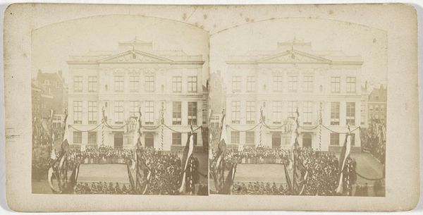 This stereoscopic image captures Johann Friedrich Stiehm's "Fountain with Obelisk in front of the House of Representatives, Berlin." The sepia tones lend a sense of distance, inviting us to consider the composition's interplay of vertical and horizontal lines. The obelisk, a rigid vertical form, asserts a dominating presence, acting as a symbolic marker of power and authority. This is contrasted by the horizontal expanse of the fountain and the House of Representatives in the background. The rigid architectural lines and the formal structure of the building provide a backdrop to the organic forms of the figures gathered around the fountain. These figures introduce a human element, softening the otherwise austere environment. The photograph uses its formal elements to engage with ideas of civic space, public life, and representation. The fountain, a gathering place, provides a space for social interaction in contrast to the solemnity of the obelisk and the House of Representatives. The image doesn't just depict a physical space but presents a structured visual discourse.