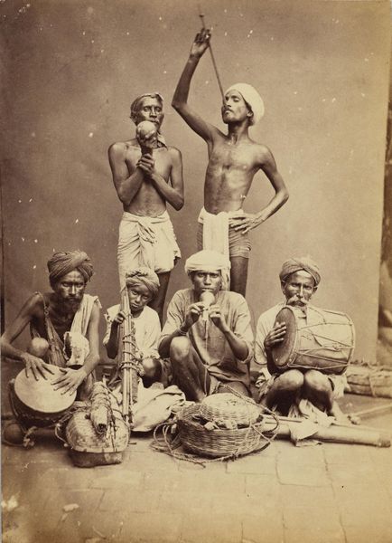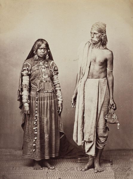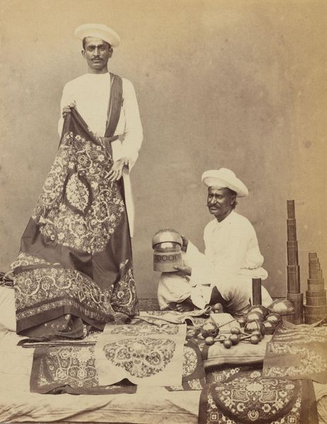 Editor: This is Willoughby Wallace Hooper's "Untitled (man in costume)," its date is unknown. It's a striking photograph; the man's gaze is so direct. What historical narratives do you see at play here? Curator: Hooper, as a colonial photographer, was capturing images of power dynamics. How does the sitter's elaborate costume and weaponry both reinforce and potentially subvert colonial expectations of representation? What do you think? Editor: I hadn’t considered the potential subversion. Perhaps he's reclaiming agency through the very act of being photographed in his finery. Curator: Exactly. It makes you wonder, doesn't it, about the complexities of identity and representation within the frame of colonial history. Editor: It definitely gives a lot to think about. Thanks! Curator: My pleasure! It's always rewarding to re-examine these historical images with a contemporary lens.