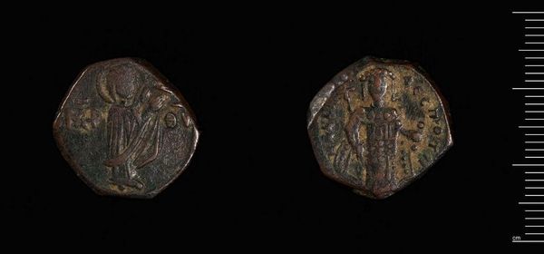 Editor: Here we have a coin of Isaac II, of undetermined date, at the Harvard Art Museums. It's small, and the images are worn from age, but it's fascinating to see history in such a tangible form. What can you tell me about the context of this coin? Curator: This coin speaks volumes about the Byzantine Empire under Isaac II. Currency wasn't just a medium of exchange; it was a powerful tool for projecting imperial authority. What do you notice about the imagery? Editor: I see figures that seem religious and imperial. Curator: Exactly. The choice of imagery, the style of depiction, and even the coin's metallic composition, were all carefully controlled messages aimed at both domestic and foreign audiences. Consider how this coin, circulating within and beyond Byzantium, shaped perceptions of Isaac II's power. It's fascinating to think about, isn't it? Editor: Definitely. I hadn't considered how much power could be packed into a small coin. Curator: Indeed, these objects offer us a unique window into the political and social landscape of their time.