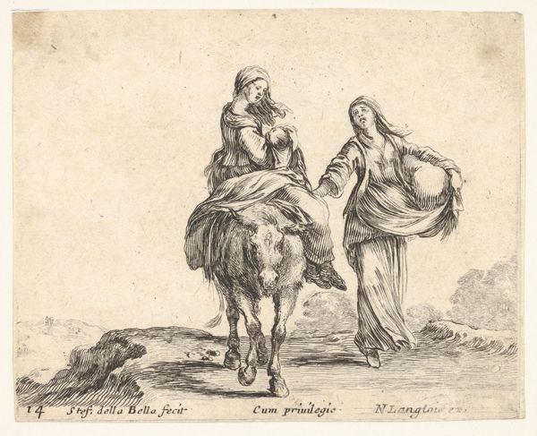 Editor: Here we have Stefano della Bella's 1649 etching, "A woman seated to left holding a child, facing right in profile, conversing with a standing woman in center, carrying one child on her back and another in her arms." The delicate lines create a scene of everyday life, but the figures look quite burdened. How would you interpret this piece? Curator: Well, looking at this etching through a historical lens, the figures reflect broader social realities of the time. The artwork appears following the end of the Thirty Years’ War. These genre scenes gained popularity and served to make commentaries on everyday life in that context. Editor: That makes sense, there's definitely a weariness present. Is that related to the print’s reception? Curator: Exactly. Della Bella made a number of prints commenting on such social issues, shaping public opinion of his subjects through visual media. Note the bare feet of the standing woman, suggesting poverty, juxtaposed with the church and the figures disembarking the boat. Where do you think Della Bella is guiding us? Editor: It's interesting how the composition leads the eye from poverty to possible prosperity and institutional stability. It speaks volumes about social stratification. It almost looks as if the seated woman on the left is questioning why they are in the state that they are in. Curator: Precisely! Consider too the role prints like these played. They were relatively accessible and could circulate widely, informing opinions about wealth distribution during this post-war period. That’s how art actively shaped and mirrored societal attitudes. Editor: I hadn't thought about it that way, that prints at this time acted as a kind of political statement. Thank you! Curator: My pleasure. I’ve certainly learned something as well. It's a potent reminder of how art reflects and influences the course of social history.