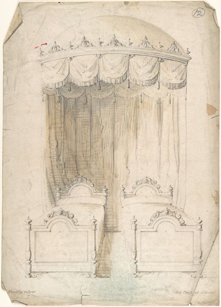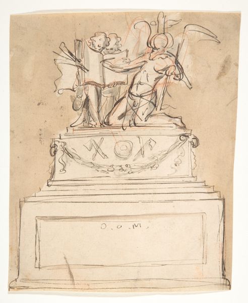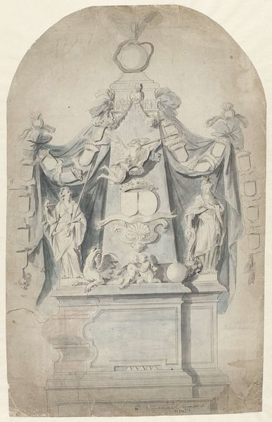 Curator: We're looking at "Design for a sepulchral monument in the form of a pulpit" by Pieter Verbruggen the Younger, likely created between 1686 and 1724. It's an ink and print drawing currently held at the Metropolitan Museum of Art. Editor: The first thing that strikes me is how theatrical it is, a stage for contemplating mortality, rendered in washes of sepia ink. There's a strange drama being played out here. Curator: That's insightful. Verbruggen was working within a Baroque idiom, a style that loved dramatic presentation. Sepulchral monuments were often designed to inspire reflection on death, but also to showcase the family’s power and piety. Editor: And power certainly appears as part of the material production itself; designing something like this requires the time and labor of skilled artisans, costly pigments, suggesting someone is trying to control how their legacy will be crafted, down to the very line. Curator: The skulls are central symbolic devices, the memento mori, intended to remind the viewer of the transience of life and the omnipresence of death. Also notice the crucifix topping the composition; an icon of rebirth and faith over mortality and passing. Editor: Right, because there's the obvious question of whether such spectacle is about mourning and loss or constructing memory. Even the deliberate, if rough, crafting of the lines, is there something authentic in the labor that honors those lost or simply overwrites it? Curator: In that era, the creation of such monuments often fulfilled both needs: the very material expense served as testimony, literally, a statement for generations to come, designed to reinforce connections between ancestors and their kin. It also provided much needed employment during times of famine. Editor: It all certainly comes together. Even a relatively simple ink-wash design as this offers complex points for analysis if one pauses to think about who benefits from this commission, from its designers, craftsman, commissioners, consumers. Curator: Absolutely, I now recognize how the weight of historical context impacts not only its creation but also our understanding of its enduring visual motifs. Editor: Agreed, examining this drawing for the design illuminates larger themes on commemoration and craft itself; definitely something to carry with us.