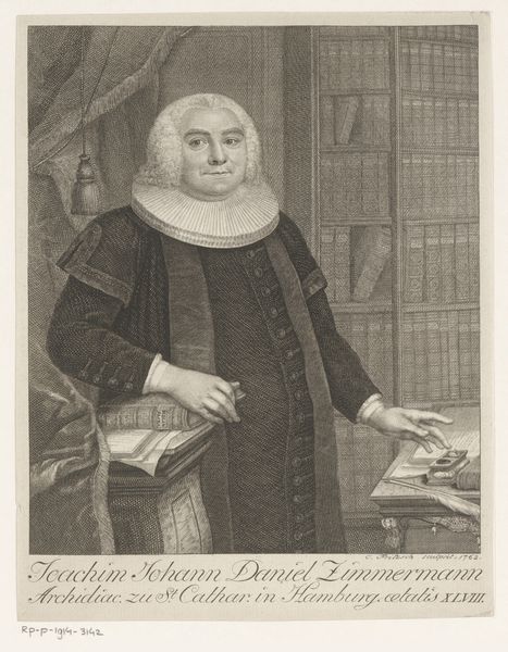 Christian Fritzsch’s print portrays Ernst Ludwig Orlich, a pastor in Hamburg, with fine lines and a clear formality typical of the period. Fritzsch created this portrait during a time of rigid social hierarchies; Orlich’s attire and posture underscore his status and role within the church and society. His large collar and poised hand holding a book each suggest a cultivated persona. The print can be understood as a cultural artifact reflecting the power dynamics of the 18th century, where clergy held considerable social and intellectual sway. It invites us to think about how identity was constructed and communicated through portraiture, especially for figures in positions of authority. What can a portrait tell us about power, and how do such images shape our understanding of historical figures and their roles?
